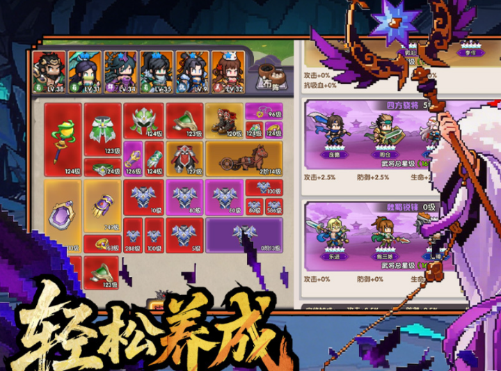 总体来说这是个策略卡牌手游,上手门槛低,玩法上限又很高,采用了独特的像素艺术风格,还原了经典三国视觉记忆,让每个角色都有鲜明辨识度,战斗结果比较依赖玩家们对机制的理解,比方说武将站位,技能释放节奏,阵营克制关系;