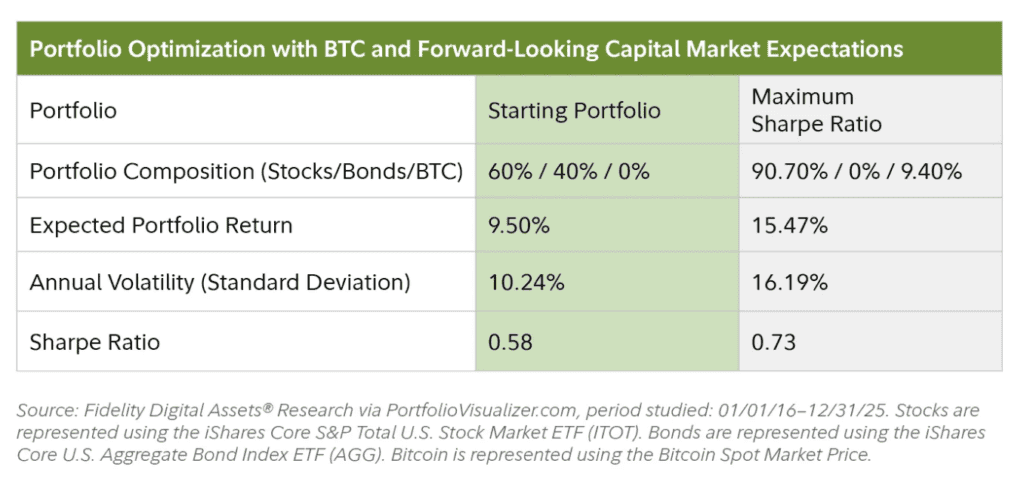 采用富达保守前瞻假设(比特币年化回报25%、波动率50%,股票回报14.5%)进行均值-方差优化后,最大夏普比率组合包含9.4%比特币,且债券配置降至零。