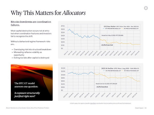 两次案例中,机制分类器均在价格确认趋势前识别出协同崩溃。这些下跌周期的共同特征是投机资本击溃耐心资本,导致市场协调性坍塌。Delphi Digital指出,当前配置者面临的核心问题是:现有市场条件是否仍支持结构性持仓。