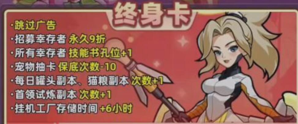 月卡则强化战斗与构筑能力:常驻卡池虹卡每日可自选1次,大幅降低核心阵容成型门槛;副本与竞技场玩法同步解锁三倍收益,加速角色成长与策略验证。终身卡为一次性投入型福利,生效后永久免广告干扰,幸存者招募享9折优惠,并持续发放钻石、技能书等高价值养成材料,长期复利效应显著。