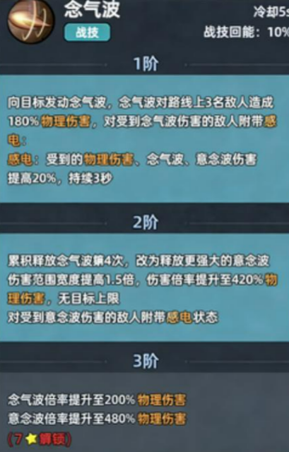 其战技“念气波”为战斗起手式,对直线三目标造成180%物理伤害,并施加持续3秒的“感电”状态。该状态本身不造成伤害,但为后续所有“念气波”与“蓄念波”命中提供20%额外伤害增幅,构成整套输出循环的底层触发条件。因此,每场战斗首回合必须优先使用该技能完成感电挂载,否则后续增益链无法激活。