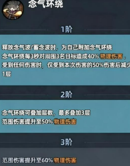 一星被动“念气环绕”强化生存维度:每次释放技能后,每3秒自动对周围敌人造成一次范围伤害,并生成一个持续3秒、减伤50%的护盾。二星被动“雷龙出海”则深化伤害协同:对处于“感电”状态的目标,额外造成100%物理伤害,并使其进入“雷龙状态”,进一步提升其所受普攻伤害20%。两项被动与感电机制、大招联动,共同构筑起“挂状态→扩范围→叠伤害→续时长”的闭环输出模型。