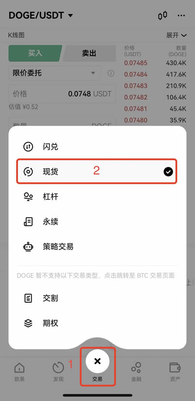 以DOGE/USDT交易对为例,选择限价委托模式,设置预期价格和购买数量后提交买单,系统将在市场价格达到设定值时自动成交。