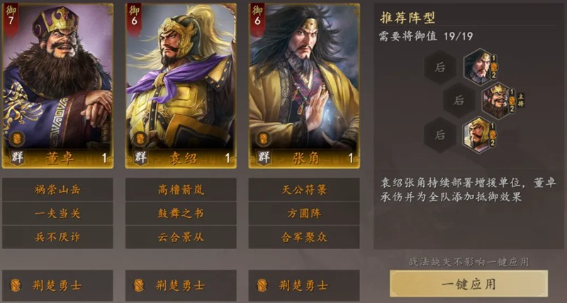 召唤盾阵容是盾兵体系中非常值得投入培养的组合,推荐指数很高。这套阵容由董卓、袁绍、孟获构成,是在一个经典的PVE组合基础上优化而来,改动不大但战斗力提升显著。当盾兵的相关科技点满后,这套阵容甚至能独立挑战11级的弓兵资源地,无需额外配置队伍,节省了大量发育精力。在三国志王道天下中,阵容的合理搭配是制胜的关键。