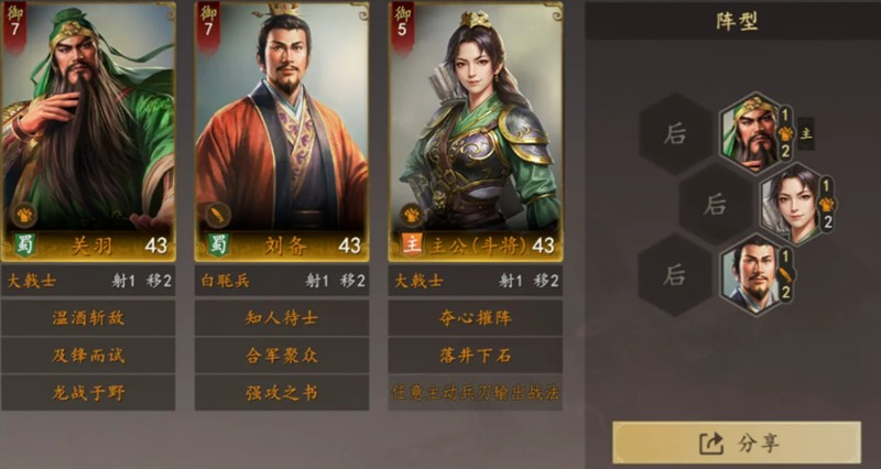小桃园枪的战术思路较为直接,即由刘备提供治疗,主公和关羽担任输出核心。若想最大化伤害,可以为主公配备搴旗斩将或无坚不摧等战法。由于主公的基础速度通常快于关羽,他可以先手破防,为关羽后续的爆发创造更佳条件。