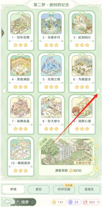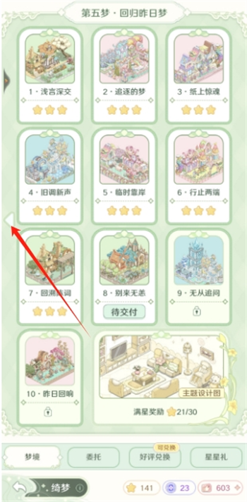 绮梦玩法分不同的章节,完成一章后会解锁下一章,每一章里有不同的小关卡,按照关卡要求布置家具最后通关评分,三星通关奖励更丰厚。每章通关完成,会有主题设计图获取。
