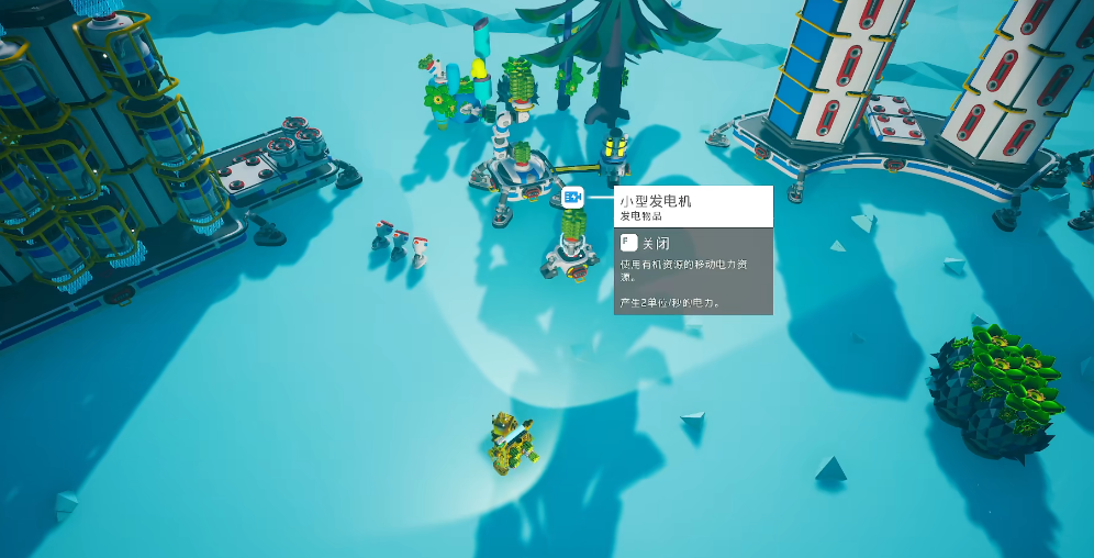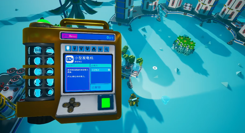 搭建一级电力系统所需材料包括:1个自动机械臂、1个大型平台B、3至5颗无害植物种子、3至5台树液采集器、1个中型储存平台、以及2至6台小型发电机。操作流程为:将植物种子集中种植于自动机械臂作业半径内;待植物成熟后,在其附近部署树液采集器以持续获取有机物;再将有机物输送至中型储存平台,并接入小型发电机完成能量转换。