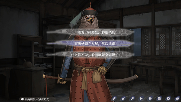 第四次财物分配时,选择"将鹰妖锁在左屋,然后逃跑!",