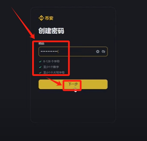 接下来需要设置账户密码,密码要求包含8-128个字符,且必须包含数字和大写字母。系统会实时检查密码强度,全部条件满足后会出现绿色对勾提示。