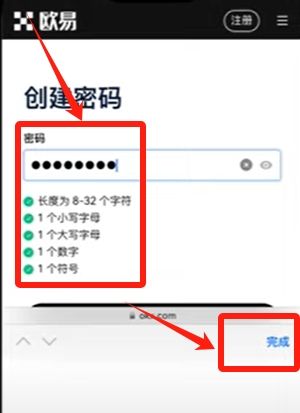 输入邮箱验证码后进入密码设置界面,注意观察密码强度提示标识,全部条件满足后点击完成按钮。