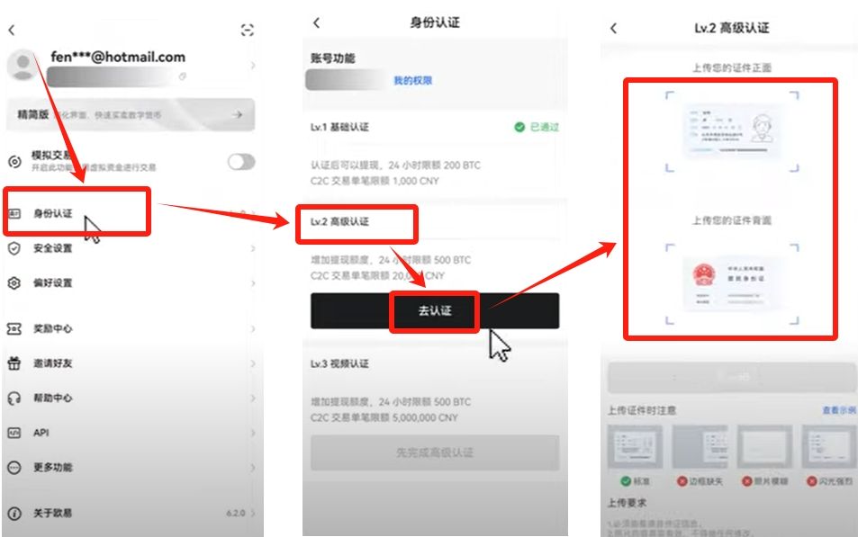L2高级认证需上传身份 证明文件照片,主要影响交易额度上限,普通用户可根据需求选择是否完成。