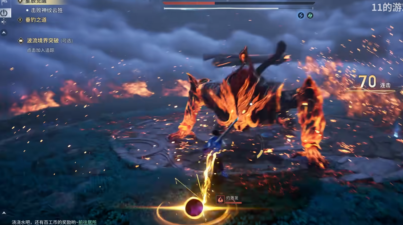 火焰践踏为其高频技能,发动时单足高抬蓄力约1.2秒,落地后对半径10米内区域造成持续高额火焰伤害。应对方式为立即向Boss本体方向翻滚切入其脚下盲区,或借助钩锁类位移装备快速登临场景石柱顶部规避。巨掌横扫为前向扇形物理攻击,附带强击退效果,范围覆盖约120度夹角、距离8米。建议输出位始终维持侧后方位站位,坦克则需在技能起手瞬间开启格挡姿态吸收关键帧伤害。