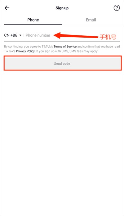 4.输入有效的手机号码或电子邮箱地址,点击"Send code"完成验证步骤