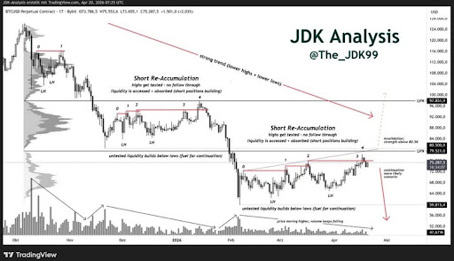 JDK Analysis指出,当前 重新积累阶段缺乏真正市场底部常见的关键信号——这些信号往往预示着持续的价格反转。因此他认为,在最终价格底部确立前,任何短期上涨空间都将受限。