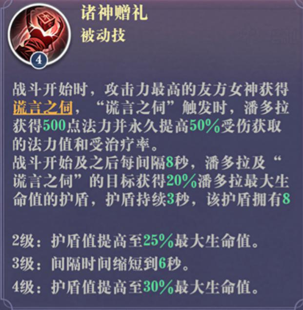 被动能力是其战术价值的核心支撑:开局提升自身30%最大生命与防御;受到持续伤害时,使施加者对其伤害降低40%。该机制大幅优化其对抗dot阵容的稳定性。另一项关键被动为:为攻击力最高的友方单位提供1次致命伤害免疫,若该效果被触发,则为其附加护盾,同时潘多拉自身获得法力值加成,并永久提升法力获取效率与受治疗效果。