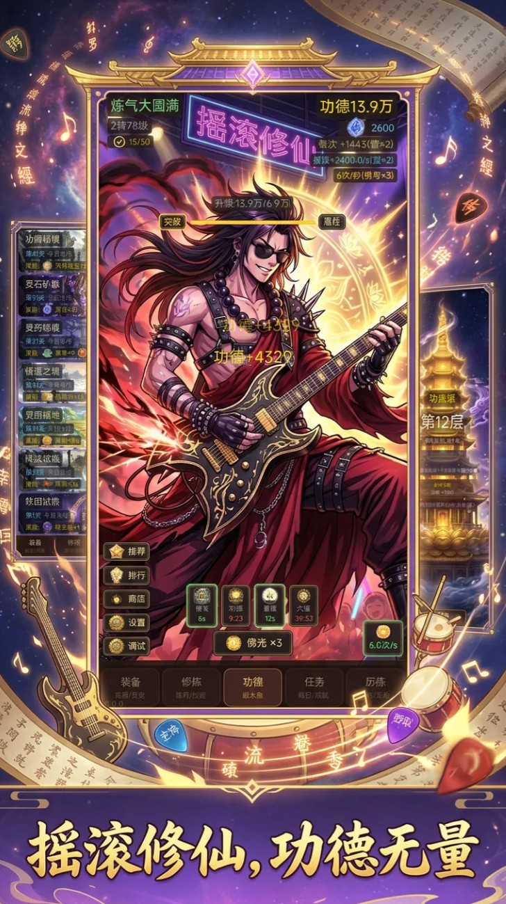 游戏核心机制围绕“敲木鱼”展开:玩家通过点击屏幕完成敲击动作,每次操作均可累积功德值。所获功德既可用于净化角色身上的煞气,亦可转化为修为与等级成长的关键资源。值得一提的是,本作配乐融合现代摇滚元素,节奏感鲜明,使重复性操作更具韵律趣味,契合碎片化放松需求。