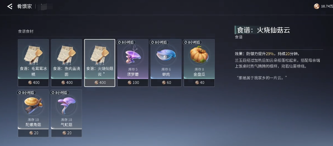 首先给大家说清楚火烧鲜菇云这道菜的获取关键,这道食谱并不是通过任务赠送或者探索掉落,而是应该来到指定的地点购买。大家不要在地图上盲目的寻找,在来到营地之后马上就能够找到一个肴馔家余欢的NPC,这就是专门出售食谱的角色,那接下来自然就是完成烹饪。然后完成烹饪也没有这么简单简,玩家需要打开任务界面,然后找到对应的任务,任务的要求其实很明确,就是把刚才购买的食谱拿出来去烹饪。