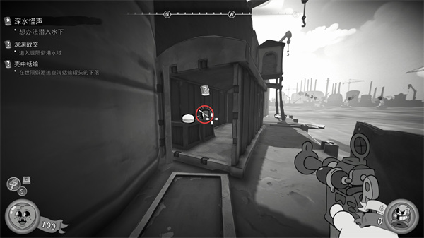 2、在 [世隔僻港] 一路探索,刚来到港口,进入左前方的货箱内,在箱子上。