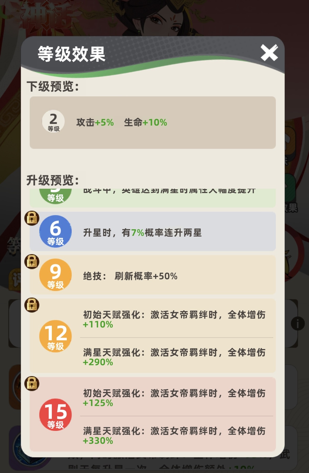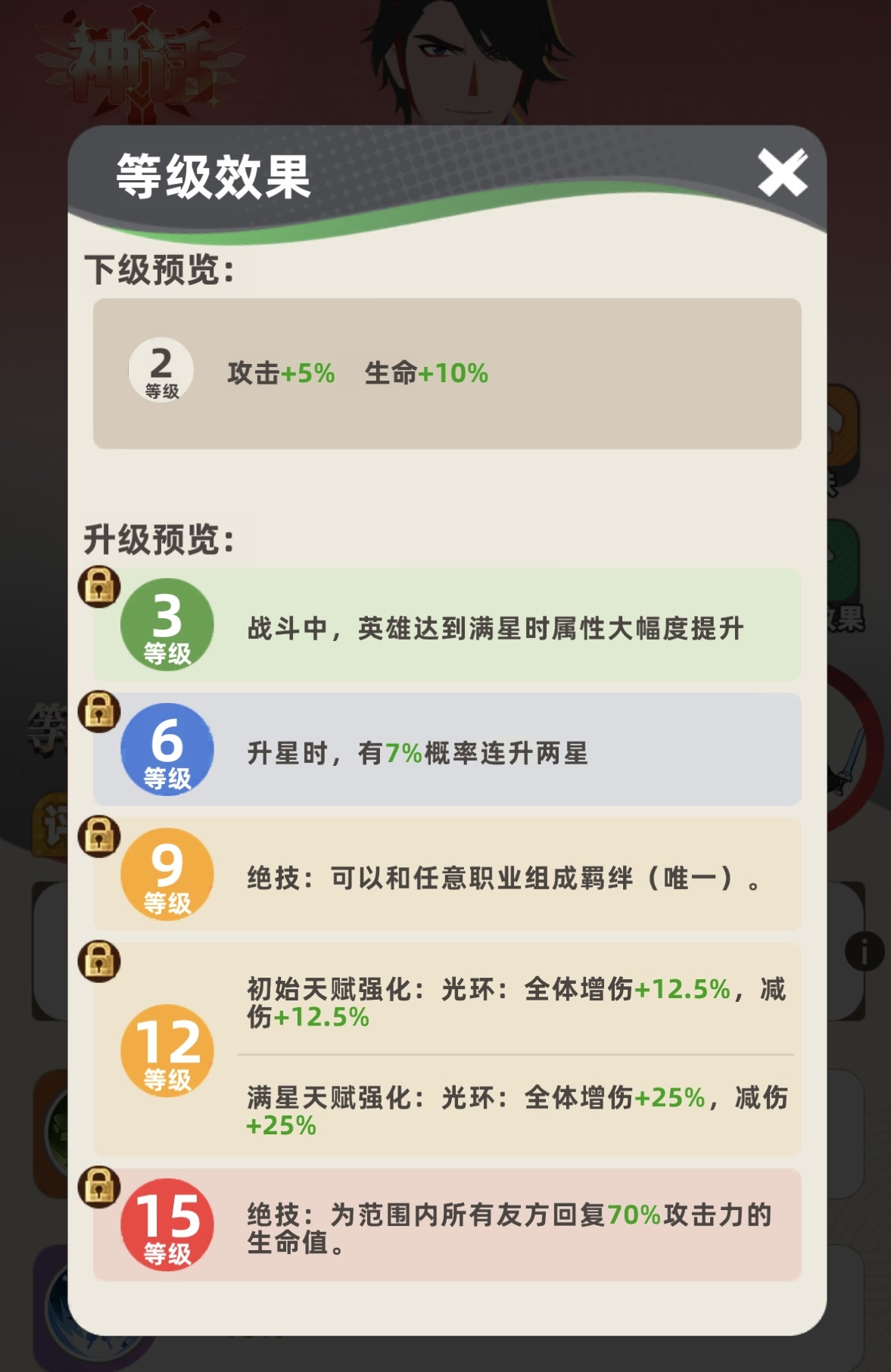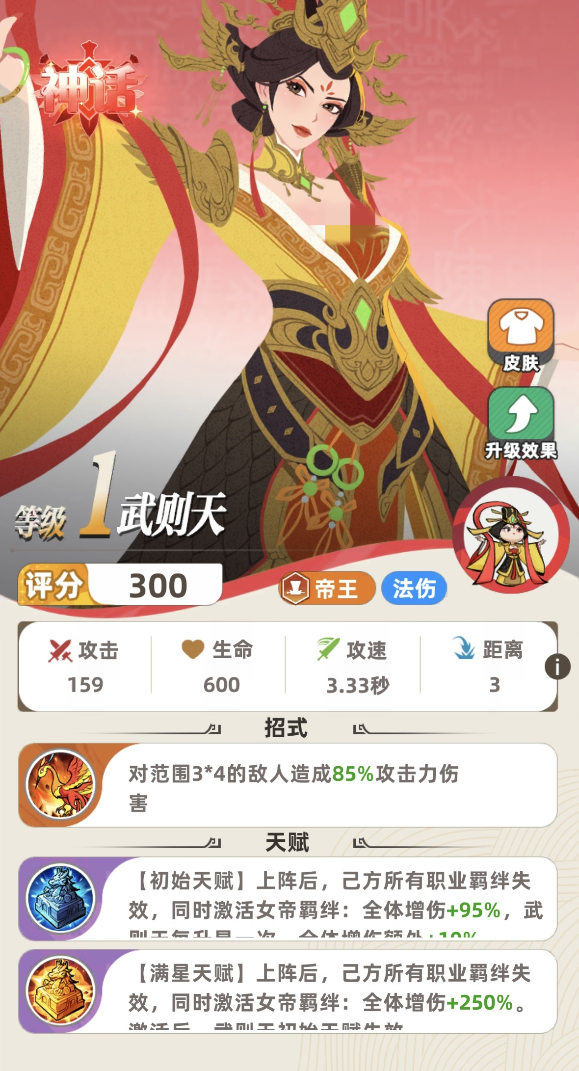 武则天为法术爆发型核心,登场即触发全局95%伤害加成,同时强制解除场上全部职业羁绊效果;升至三星后,全队增伤提升至250%。该机制意味着:选择武则天即放弃传统羁绊构筑路径,转而依赖单核驱动与技能联动。当前最优解为“张角+姜子牙+武则天”纯法系组合——张角以连锁电球实现群体高频打击,姜子牙通过提升全场我方英雄星级总数,强化蓄力后释放的高额法术波伤害,武则天则补充大范围持续AOE输出。达成理想输出循环需满足硬性培养条件:武则天与姜子牙均需升至12级,张角则须达到15级起手标准。该配置对资源投入要求极高,属高付费向战术体系,不建议轻度或零氪玩家尝试。