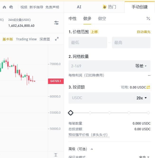 币安合约网格提供三种策略方向:中性、做多和做空。网格模式可选择等差或等比网格,参数设置支持策略池自动配置或手动自定义。