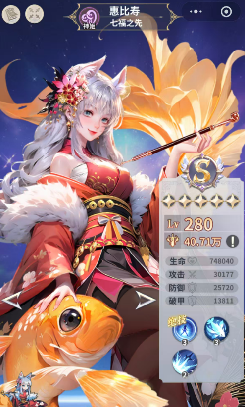 惠比寿作为神姬分支代表,主打“吞噬—反制—增益”闭环。当目标生命百分比低于10%时,可直接吞噬并封锁其行动;若目标生命高于自身,则发动280%物理伤害。其被动使全体友方获得8%防御提升;每次成功吞噬后,永久增加自身10%伤害减免,最高叠加至40%。该机制兼具控制、减伤与克制功能,在应对残血收割与高生存阵容时尤为关键。
