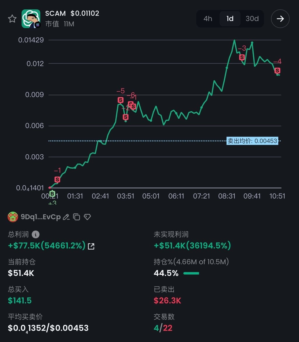 该交易者在随后几小时以0.00453美元均价抛售55.5%仓位,锁定约2.6万美元已实现利润。剩余持仓仍存在超5.1万美元未实现收益。