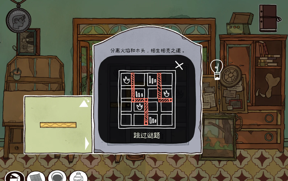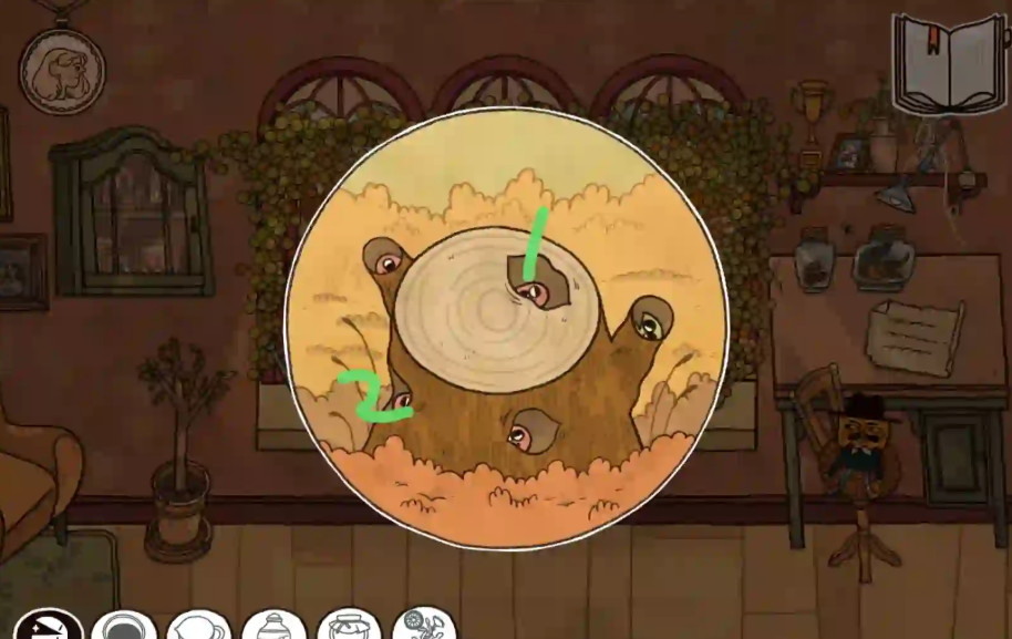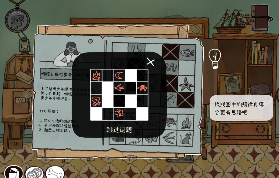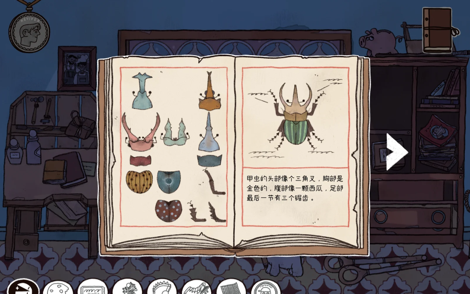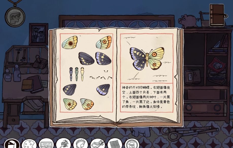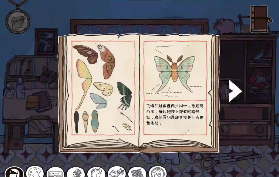 得到零食(*桌上的蜡烛可以吹灭也可以点亮)。点击右侧柜门,得到野莓。打开柜门里的书,按照提示拼出飞蛾、甲虫、蝴蝶