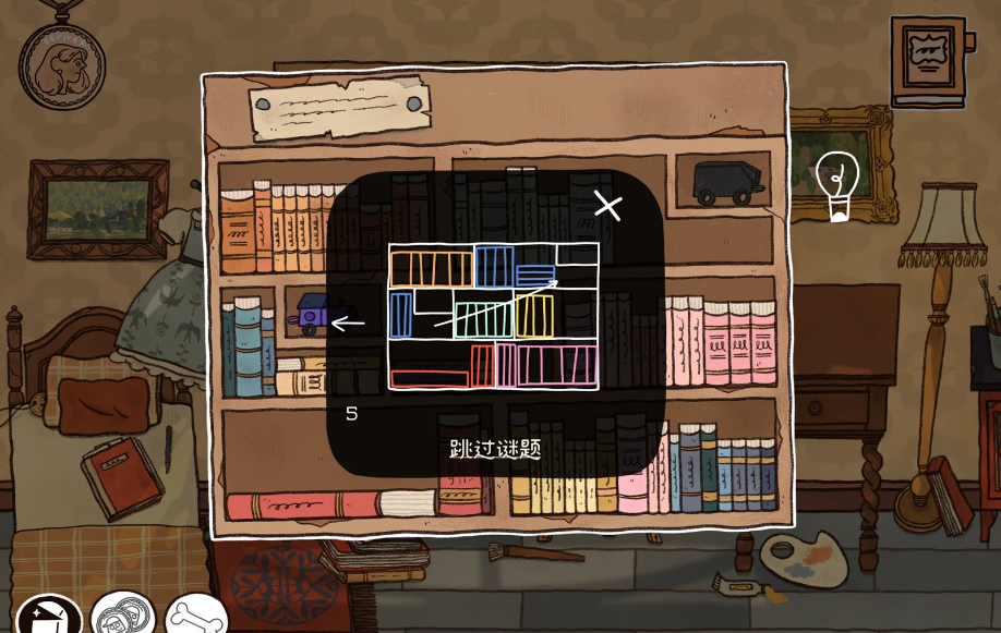 3.【女主1915】窗外的车走开了,点击小狗,小狗跑开后得到骨头。点击床上的书,根据提示记住蓝色数字:0520,点击衣架上的背包,输入0520,打开右上角口袋可得1索尔。】点击左侧商店,按照颜色整理书本