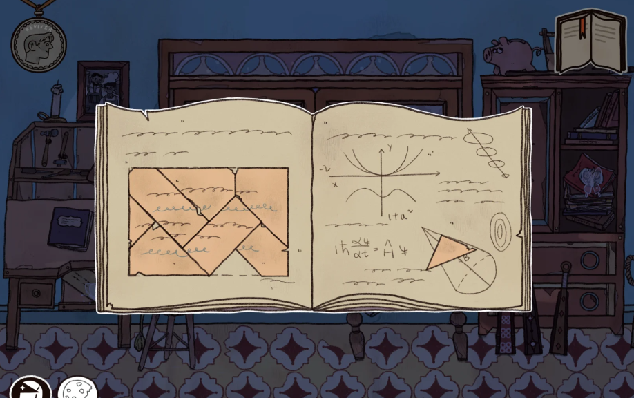 得到昆虫研究笔记。点击柜门上的猪猪,得到1索尔。打开窗,点击小狗前面的坏捕兽夹,得到坏捕兽夹。点击窗外树枝,得到坏溜冰鞋。点击桌子得到纱布。(*点击小狗会跑一圈)再回到1915将昆虫研究笔记放到桌上的本子里。
