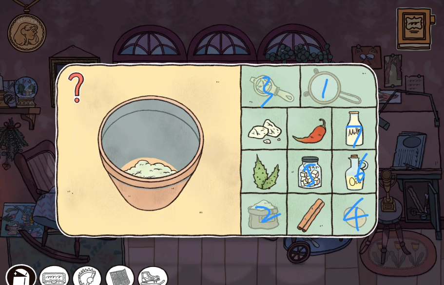 回到1917,点击窗台上的药瓶,放入大量杯和量勺,根据右侧配方配药水。要注意的是,所有药水都要一次性配好,如3号要8毫升,则必须调配好8毫升3号药水全部装在一个容器内,不可与其他药水混合,且不支持单个容器倒入垃圾桶,要倒则全部倒,可以通过利用其他两个容器调整用量。配好得到幸运药水。