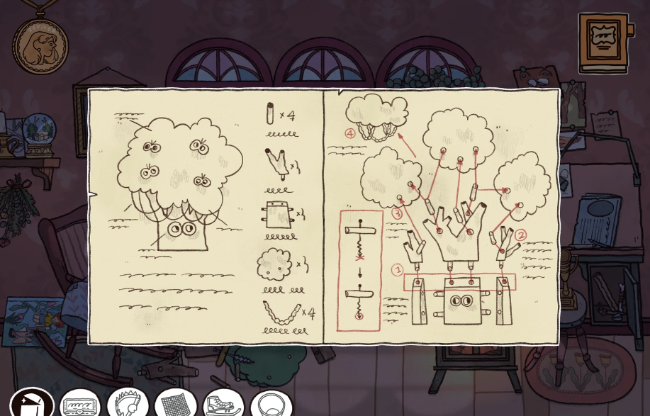 9、【女主1917】点击狗窝,得到鳄鱼下巴。与坏捕兽夹组装得到陷阱,把陷阱放在1916窗外雪人旁边。再回1917点击草丛,重获吊坠。点击沙发上的盒子,按照之前水晶球里的提示排放:月亮——黑色眼睛,五角星——白眼,四角星——橙色眼睛,葫芦——蓝色眼睛,得到金草虫。
