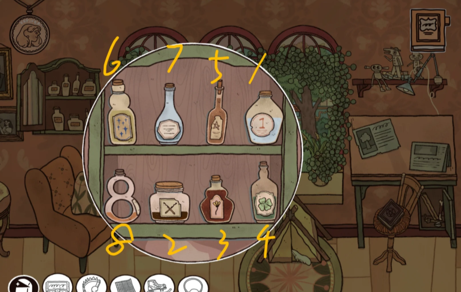 然后点击窗台下的树丛,按照画稿组装。调整到1917,点击左侧药水柜,根据瓶上的数字提示排序。