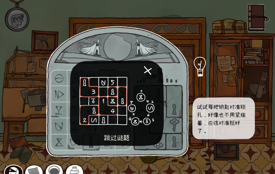 然后跳转到1918,点击桌上机关,完成拼图。拼图完成后右边的图案,顺序是以钥匙尾部圆圈排序对应的图案为准。点击柜子上方的行李箱,得到狗罐头。打开窗子点击树枝,得到蜂巢。