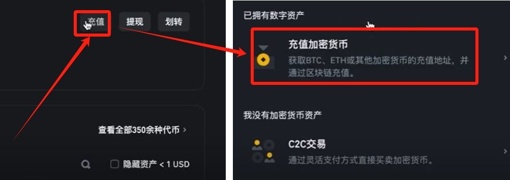 登录后进入现货账户界面,点击充值按钮选择数字货币选项。